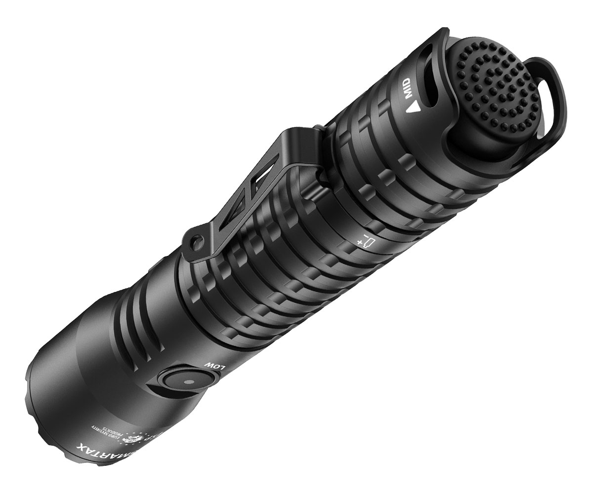 Na koncovce svítilny najdete taktický vypínač, jehož stisknutím SMARTAX rozsvítíte v režimu 25% výkonu nebo stroboskopu. Lehké namáčknutí umožňuje svícení trvající jen po dobu, kdy držíte tlačítko vypínače (taktický režim). Když vypínač lehce namáčknete dvakrát (v rychlém sledu za sebou), spustí se v taktickém režimu stroboskop. Jakmile vypínač úplně domáčknete, svítilna bude svítit ve vybraném režimu trvale.