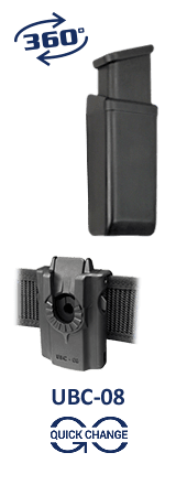 používá opaskový klip UBC-08 se systémem Quick Change ● pouzdro umožňuje rotaci zásobníku v rozsahu 360° ● samosvorná konstrukce s fixační pružinou ● určeno pro nošení zásobníků 9mm Luger ● promyšlená konstrukce pouzdra – sumky – umožňuje velmi rychlé vyjmutí zásobníku ● vyrobeno z vysoce odolného plastu ● určeno pro profesionální použití